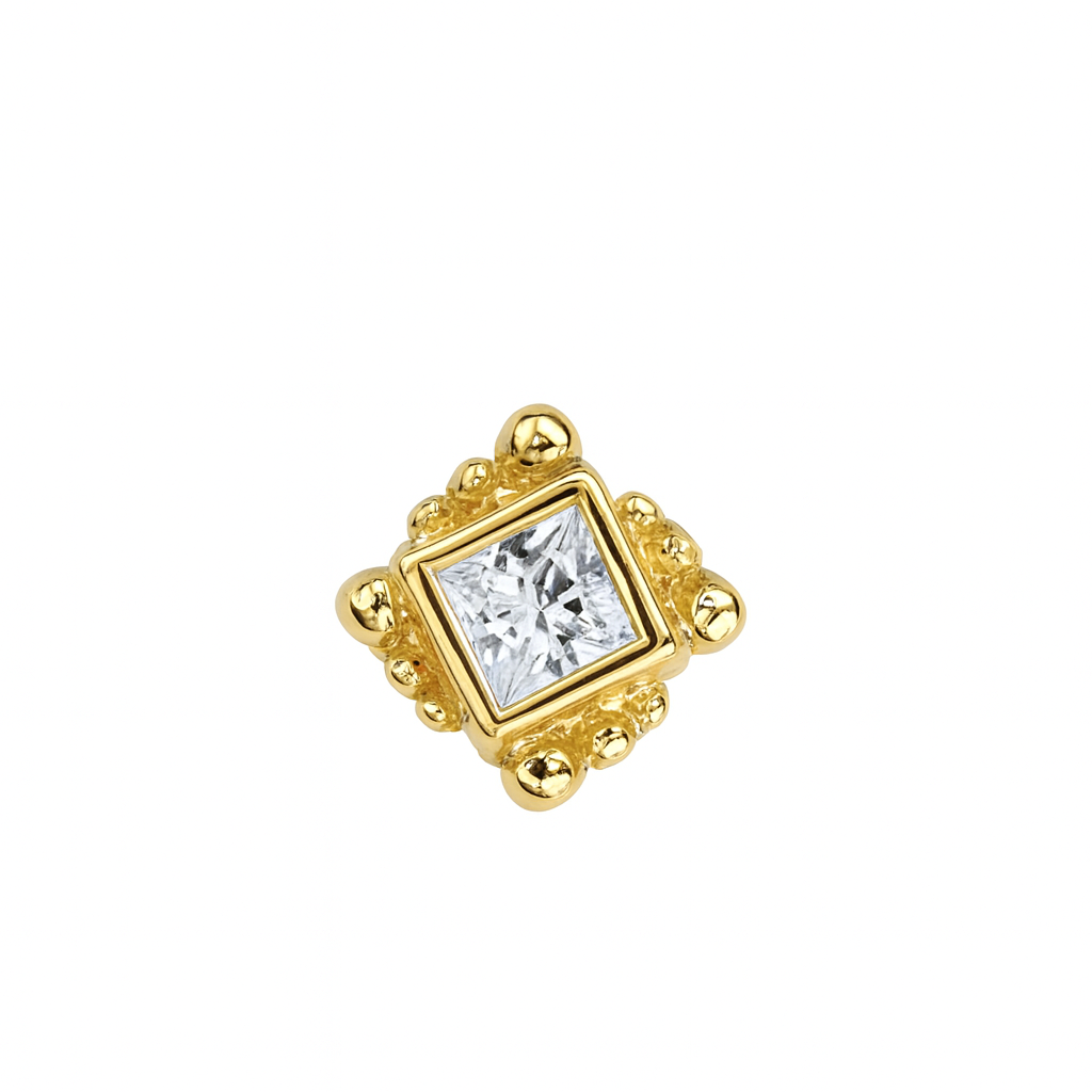 The BVLA Beaded Princess showcases a sparkling 2mm cubic zirconia set within a delicately beaded frame. Its polished, geometric silhouette adds refined elegance and subtle brilliance to any piercing, creating a timeless accent that is both modern and versatile. Handcrafted in Los Angeles from solid 14k nickel-free gold, available in yellow or white gold, with high-quality cubic zirconia. Offered in 4mm overall size. Compatible exclusively with threadless posts, one threadless implant-grade titanium post is included with each stud. Sold individually.